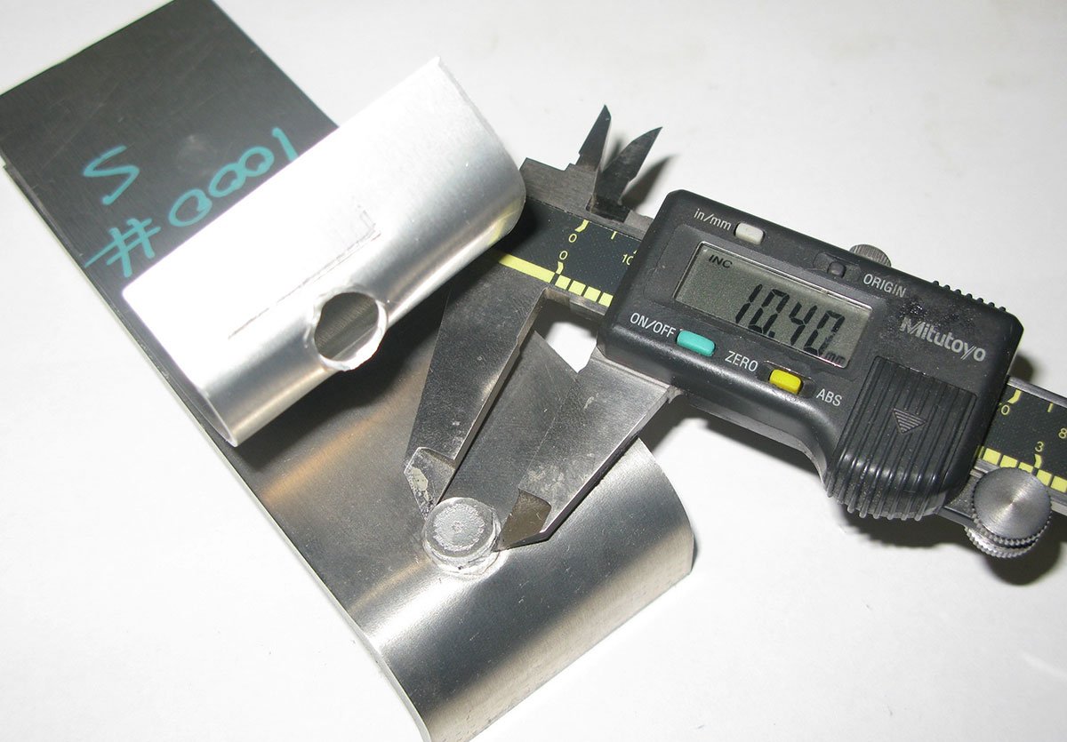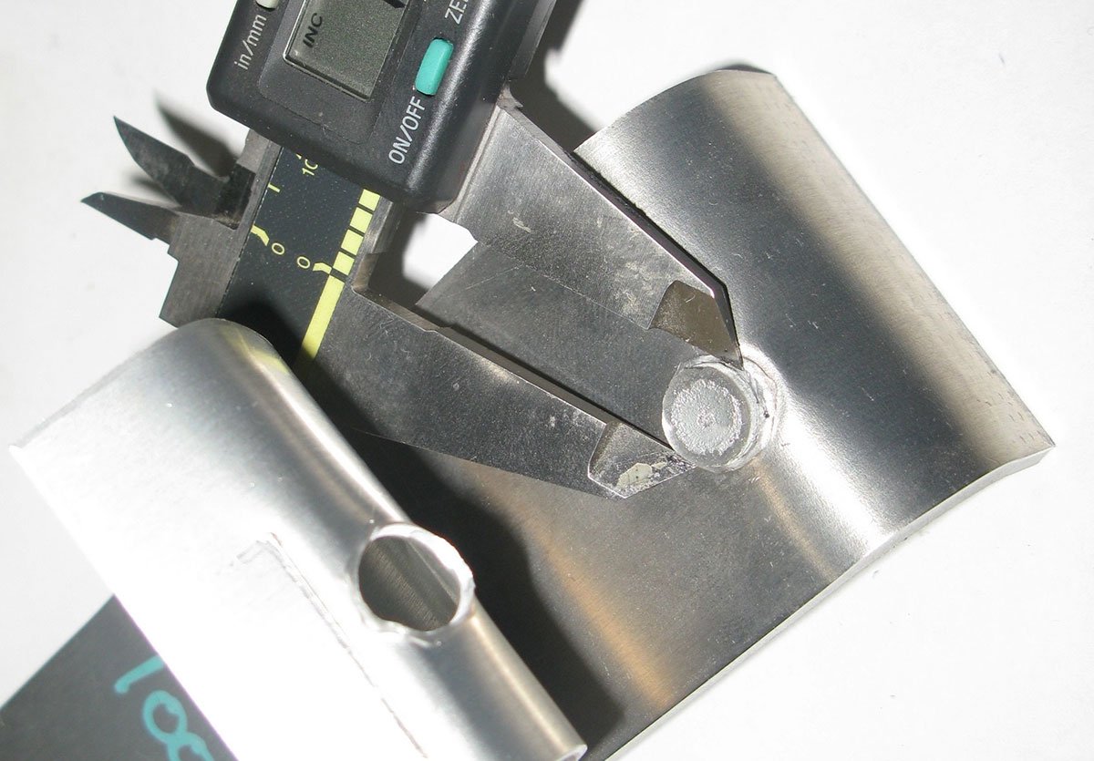 Figure-1: Photo of a peeled aluminum spot weld. The measurement displayed is accurate as the required MWS (minimum weld size) for this application was rather large relative to the material gauge.