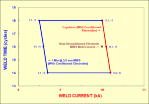 The aforementioned scenario is a phenomenon seen frequently. One way to illustrate it is with a weld lobe. A weld lobe is one way to express the robustness of a particular resistance spot welding application (see Figure-1). In essence it is a means of graphically expressing the numerous combinations of weld currents and weld times that produce satisfactory welds for a specific set of conditions (weld force, electrode cap configuration, metal stack-up, etc.). The weld lobe (sometimes called a weld window) is created by plotting the values of weld current versus weld time that correspond to a particular measurable characteristic; most typically weld size. Note: The data from the evaluation at a specific weld time is called a weld range. If more than one weld time is tested for a specific condition (highly recommended) they are combined to form a weld lobe. See Reference-2 for more details on how to create a weld range. An important caveat to this process: Weld ranges are typically performed on electrodes that have been broken in – This process, dependent on how it is done, is called conditioning, or in some cases stabilization. We will use the term conditioning going forward.